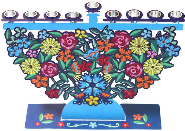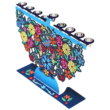 החנוכיה משלבת מגוון צבעים ודוגמאות של פרחים שניראים רקומים, צומחים ועולים מתוך הבסיס, תוך שמשאירים כמה פרחים נחים על הבסיס ו החנוכיה מגיעה עם כוסיות אלומיניום להדלקת נרות חנוכה* ומתאימות גם לערכות השמן המוכנות למי שרוצה להדר ולהדליק בשמן